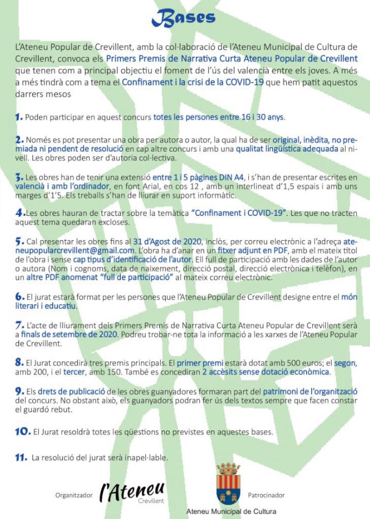 L’Ateneu Popular de Crevillent, amb la col·laboració de l’Ateneu Municipal de Cultura de Crevillent, convoca els Primers Premis de Narrativa Curta Ateneu Popular de Crevillent que tenen com a principal objectiu el foment de l’us del valencià entre els joves. A més a més tindrà com a tema el Confinament i la crisi de la COVID-19 que hem patit aquestos darrers mesos.