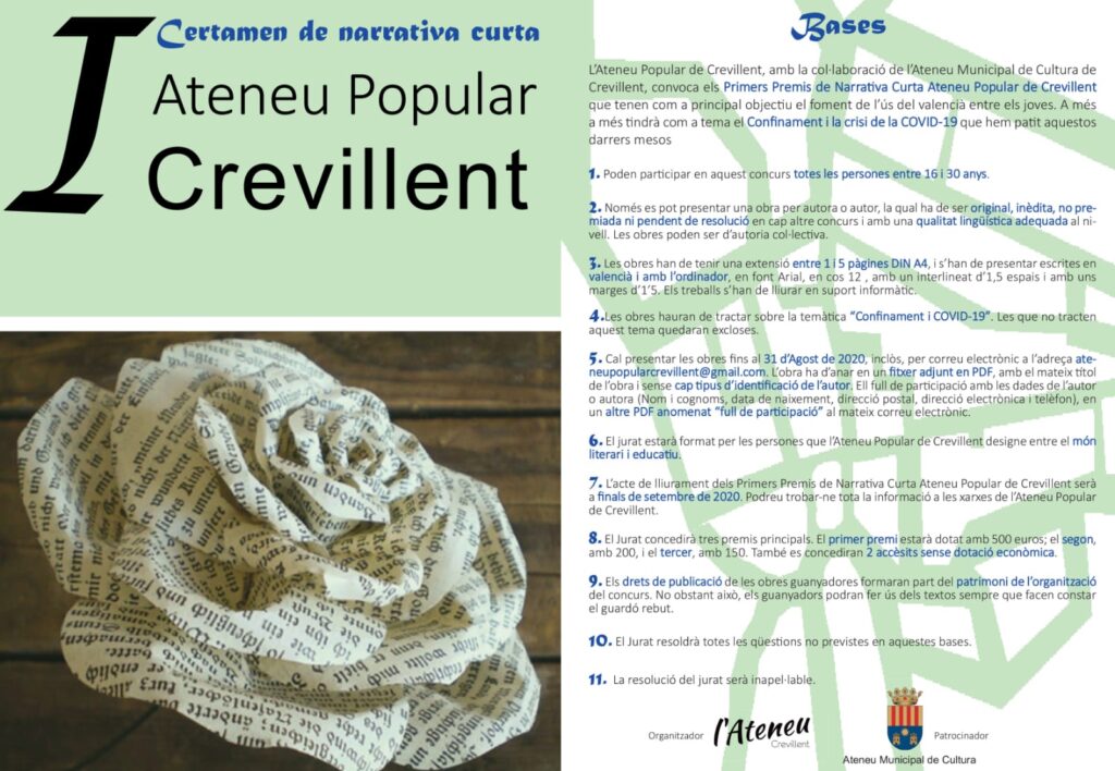 L’Ateneu Popular de Crevillent, juntament amb la col·laboració de l’Ateneu Municipal de Cultura de l’Ajuntament de Crevillent organitzen el I Certamen Literari de Narrativa Curta “Ateneu Popular”. Aquest certamen té com a objectiu el fet de potenciar el talent i la creació feta en valencià entre les persones joves d’entre 16 i 30 anys. Els treballs hauran de girar al voltant d’una temàtica relacionada amb l’actualitat com és la COVID-19 i el confinament.