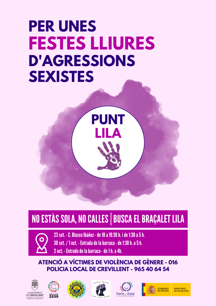 Crevillent – La Concejalía de Igualdad del Ayuntamiento de Crevillent y la Associació Feminista Isabel Alfonso Candela han puesto en marcha para las fiestas de Moros y Cristianos un Punto Lila de acompañamiento y apoyo a las mujeres víctimas de violencia de género y de información para cualquier persona que lo necesite. El 23 de septiembre, durante la noche de Cabos, el Punto Lila estará funcionando en la calle Blasco Ibáñez desde las 18:00 hasta las 19:30 horas y de 01:30 a 5 de la madrugada. El viernes 30 de septiembre y el sábado 1 de octubre estarán en la entrada de la barraca municipal de 01:30 a 05:00 de la madrugada.