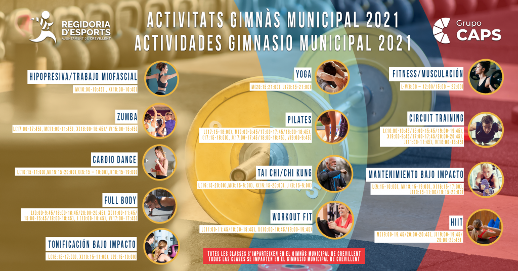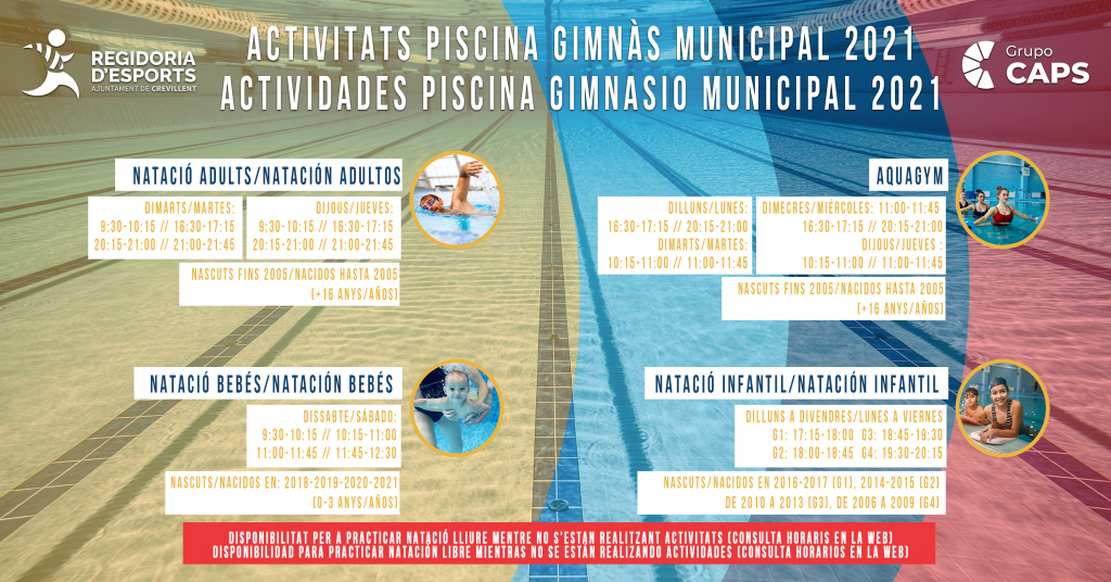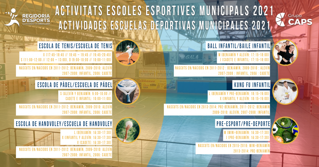 Ja estan disponibles els calendaris amb les dates i horaris d’inscripció a les activitats esportives municipals per a aquest any 2021, que començaran dilluns que ve, 24 de maig, i podran realitzar-se en el Gimnàs i la Piscina Municipal en horari de demà, de 8.00 a 13.30 h i únicament en el Gimnàs a les vesprades, de 15.30 a 20.00 h.
