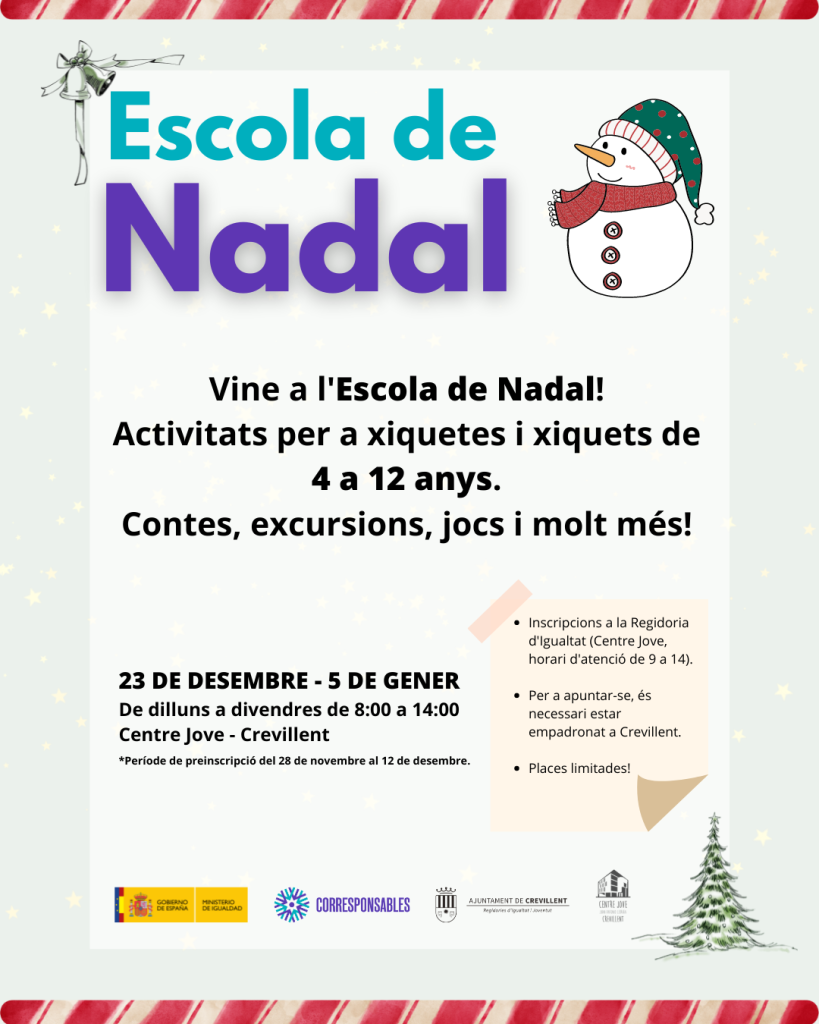 Crevillent – Les regidories d’Igualtat i Joventut de l’Ajuntament de Crevillent han organitzat l’Escola de Nadal al Centre Jove. L’Escola de Nadal portarà diferents activitats d’oci a les xiquetes i xiquets crevillentins de 4 a 12 anys durant el període de vacances del 23 de desembre al 5 de gener, com passa a l’estiu amb les escoles d’estiu. Totes les activitats de l’escola serviran per a fomentar valors d’igualtat en un ambient divertit per als participants.