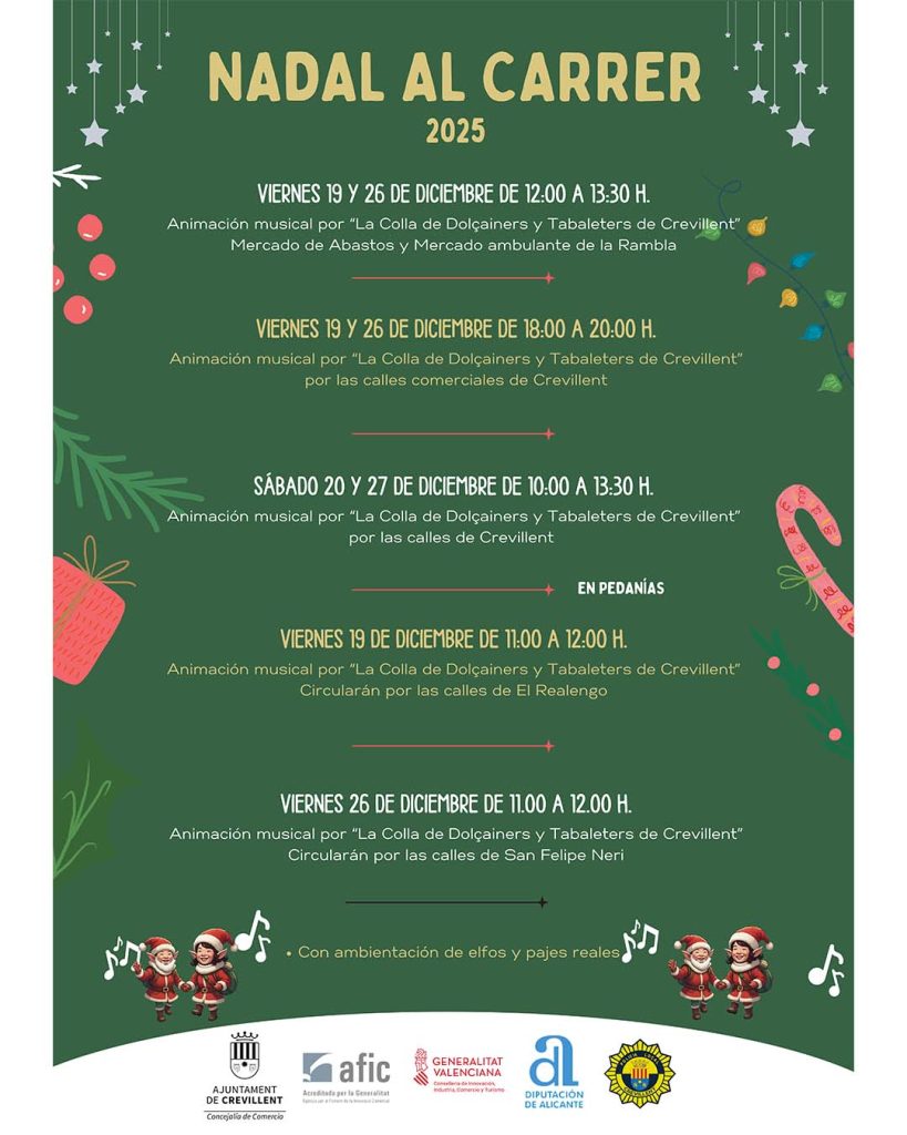 Crevillent – La concejal de Comercio , Gema Escolano Berná, ha anunciado este lunes la actividad “Nadal al Carrer 2025” en la que la Colla de Dolçainers i Tabaleters de Crevillent inundará de música las calles comerciales principales de nuestro casco urbano, además de desplazarse a las pedanías de El Realengo y San Felipe Neri para promocionar el comercio y la actividad económica local.