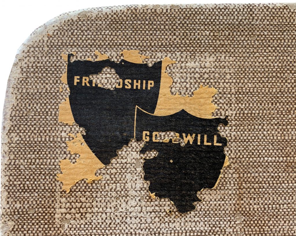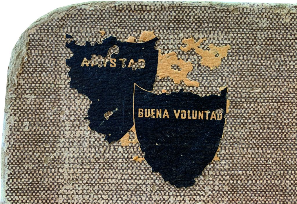 Foto 4. Detalle de la maleta, que, según cuenta Salvador Aznar, le entregaron de pequeño en Los Molinos. Se puede leer en inglés “Friendship. Goodwill”, “Amistad. Buena voluntad”.