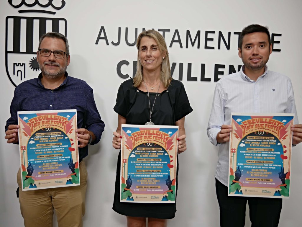 El sábado 7 de octubre, en el espacio habilitado en la Plaza de la Comunidad Valenciana, presenciaremos, a partir de las 12:00 horas, el concierto del grupo local Impronta Cover Band. Ya por la noche, en la calle Óscar Esplà, será el turno de bailar y cantar con Second, grupo murciano referencia en el mundo del indie que “en su gira de despedida, porque se retiran como banda de los escenarios, pues han elegido Crevillent para actuar”, según el edil. La noche culminará con las sesiones de Dj Barce y de Dj Poncini. Sobre Dj Barce, García Magro resalta que “es un Dj de primer nivel porque está pinchando en el Starlite de Marbella, en discotecas de todas España, en festivales etc.”, al tiempo que pone en valor “la sesión del crevillentino Dj Poncini, muy conocido por la música que pincha y que tiene un público increíble así que apostamos por el talento crevillentino”.