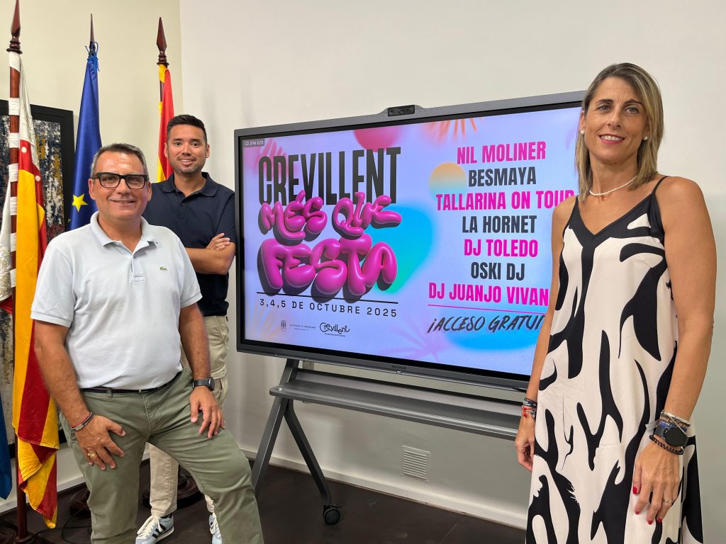 Crevillent – La alcaldesa Lourdes Aznar Miralles, junto con el concejal de Fiestas, Antonio Candel Rives, y de Ocio, Pedro García Magro, han presentado este miércoles el cartel de la Barraca Municipal 2025 en el marco de las fiestas patronales y de Moros y Cristianos de Crevillent. “Nil Moliner, Besmaya, La Hornet y el show de Tallarina On Tour lideran este potente cartel de actuaciones gratuitas para disfrutar durante nuestras fiestas”, ha destacado la alcaldesa Lourdes Aznar.