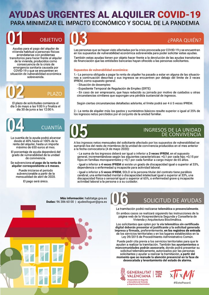 El plazo de solicitud de estas ayudas al alquiler de la Generalitat, que tienen como objetivo minimizar el impacto económico y social de la Covid-19, ha comenzado ya y finalizará el 30 de junio