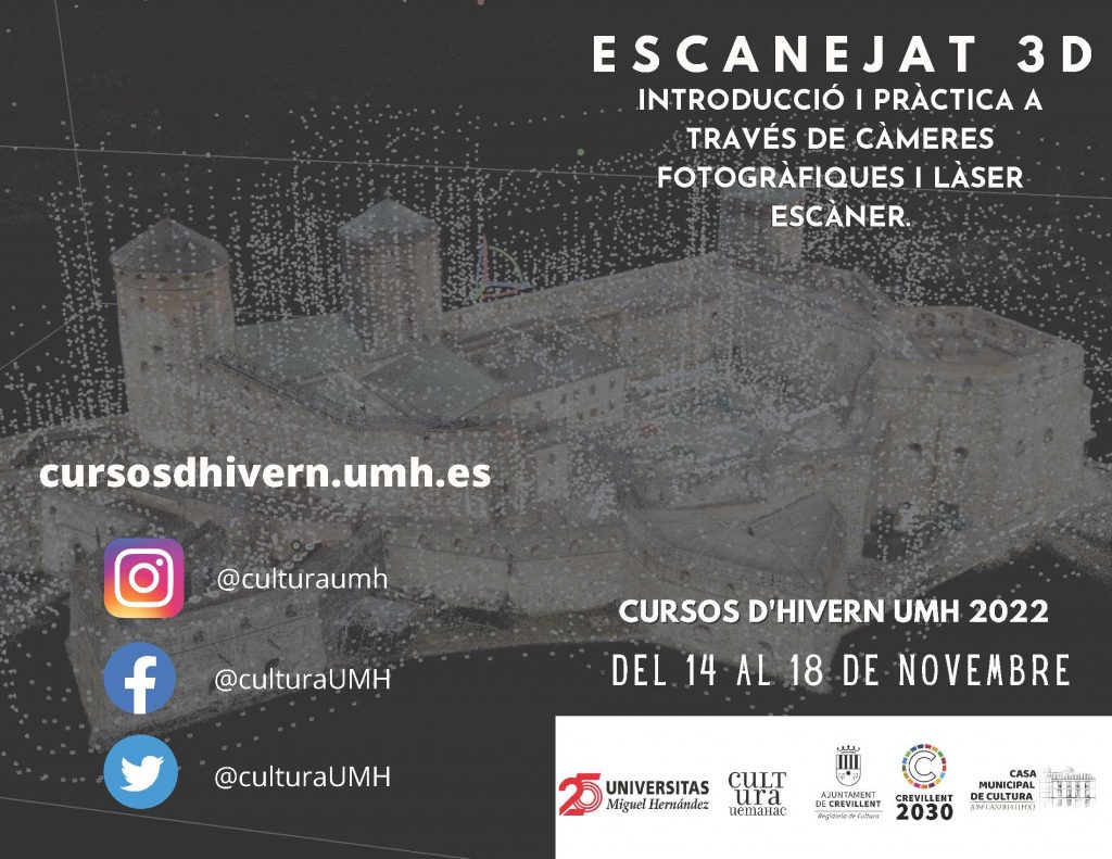 El curso “Escaneado 3D. Introducción y práctica a través de cámaras fotográficas y láser escáner”, cuyos docentes serán Adrián Riquelme y José Antonio Huesca, tendrá lugar entre los días 14 y 18 de noviembre, de 9 a 14 h. Tendrá una duración de 25 horas y sus objetivos se basan en adquirir conocimientos básicos de las técnicas de adquisición remotas y conocer la manera de conseguir modelos de superficie mediante instrumentación láser escáner y cámaras fotográficas.