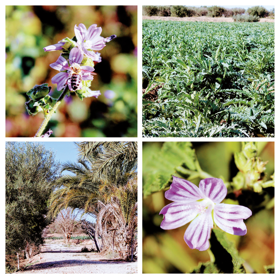 En un extens bancal, trobem una plantació de carxofes i la visió obri les nostres papil·les gustatives amb el seu verd frescor i la imatge d’una preparació culinària de les mateixes d’una i mil maneres; com per exemple en un suculent arròs i verdura o senzillament a la planxa. A continuació, apareix una laboriosa abella plena de pol·len libant una flor de melva (Lavatera cretica). Les melves campen per tot arreu exhibint les seues tonalitats morades en les seues delicades flors contrastant amb el verd intens de les àmplies fulles. Un petit caragol de «vinya» dorm en una assolellada reixa esperant el moment en què la pluja li faça despertar del seu llarg somni. Aquests caragols solen ser molt abundants i deuen el seu nom al fet que agraden de posar-se en els pals de les plantacions de les parres agrupats en bigarrats conjunts. En altres temps, constituïen un recurs alimentari més per als temps d’escassetat en els calorosos dies de l’estiu; elaborats en una senzilla salsa de ceba, tomata i pa ratllat.