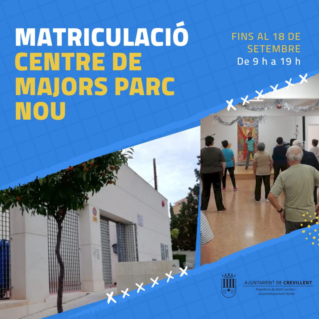 La Regidoria de Drets Socials i Majors informa que ja està obert el termini de matriculació per als tallers del Centre de Majors Parc Nou de Crevillent (curs 2020/2021). El període d’inscripció va començar aquest dilluns, dia 7, i continuarà vigent fins divendres que ve 18 de setembre. Per a matricular-se és necessari acudir al Centre de Majors en horari de 9.00 h a 19.00 h.
