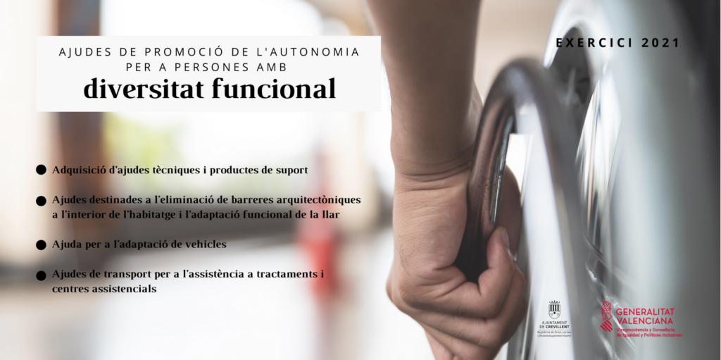 La Regidoria de Drets Socials i Desenvolupament Humà de Crevillent informa que està obert el termini per a sol·licitar les ajudes personals per a la promoció de l’autonomia personal dirigides a persones amb diversitat funcional, de la Conselleria d’Igualtat i Polítiques Inclusives per al present exercici 2021.