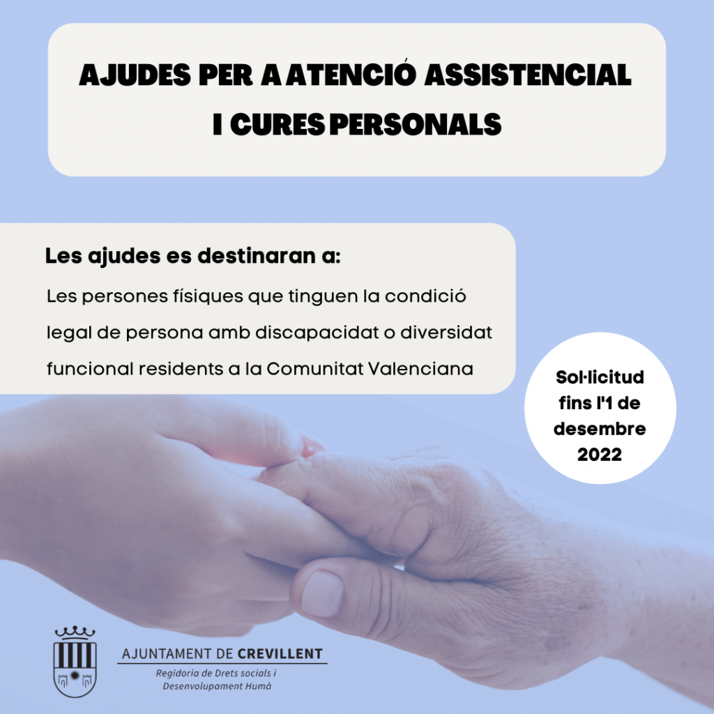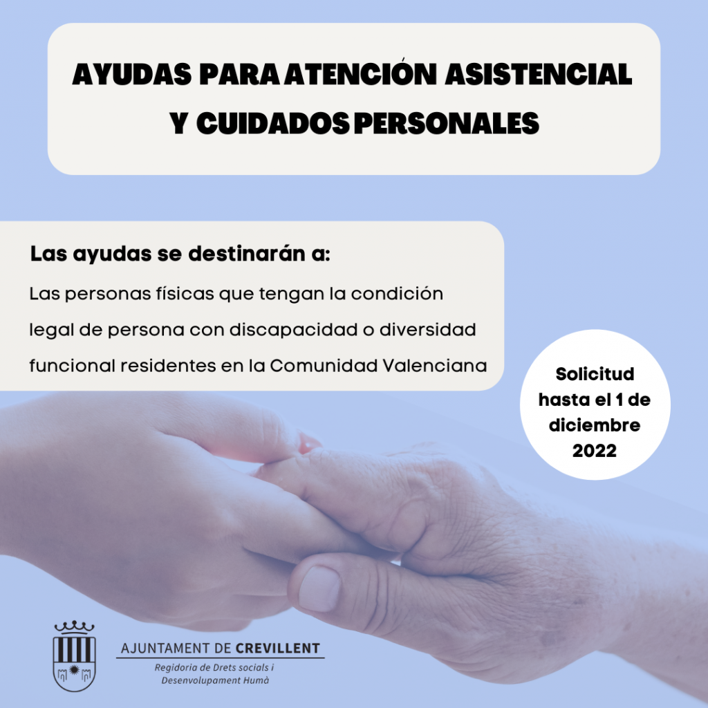 Crevillent – La Regidoria de Drets Socials i Desenvolupament Humà informa que està obert el termini per a sol·licitar les “ajudes personals per a l’atenció especialitzada residencial de persones amb diversitat funcional”, corresponents a l’exercici 2022, de la Conselleria d’Igualtat i Polítiques Inclusives.