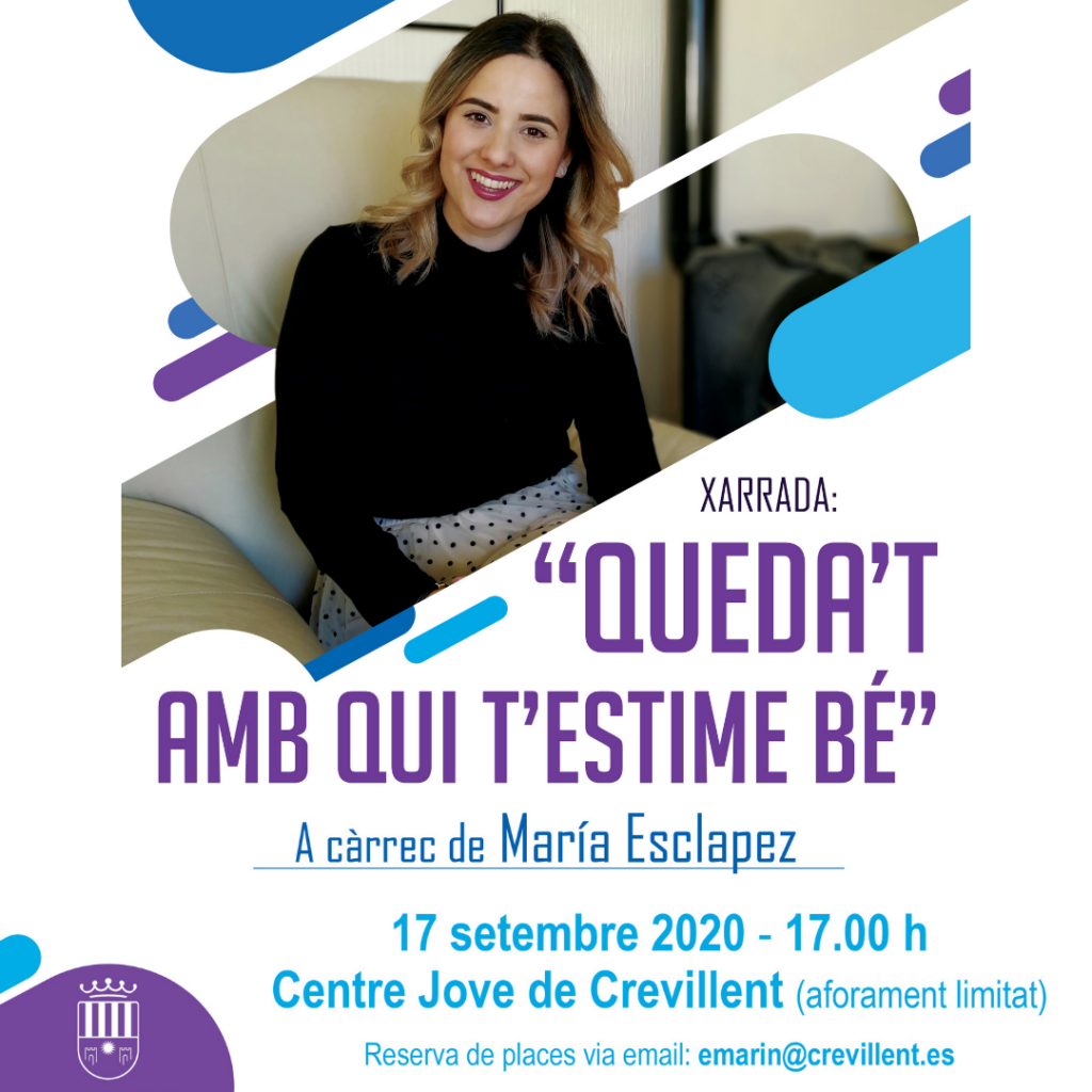 D’altra banda, la Regidoria d’Igualtat ha organitzat també una xarrada en la Sala d’actes del Centre Jove per al dia 17 de setembre, a les 17:00h, amb el mateix lema i que s’impartirà per la reconeguda psicòloga i sexòloga María Esclapez. L’edil d’Igualtat Ana Vanesa Mas informa que, encara que l’aforament per a aquesta xarrada és limitat per la crisi sanitària que estem travessant, es podrà seguir en directe a través de les xarxes socials oficials de l’Ajuntament de Crevillent amb l’objectiu de poder arribar a quanta més gent millor. Aquest mateix dia també hi haurà a la disposició dels assistents fullets amb la informació vinculada a la campanya. Ana Vanesa ha destacat que des de la seua regidoria es continuarà treballant en polítiques encaminades a aconseguir la igualtat real i sobretot l’erradicació de la xacra social que suposa la violència de gènere i que una de les millors maneres de fer-ho és amb aquest tipus de campanyes de conscienciació on arribar al màxim nombre de persones possible.