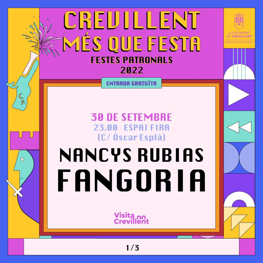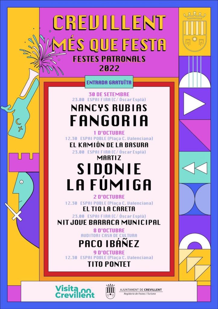 Crevillent – El regidor de Festes i Turisme, Josep Candela, juntament amb l’alcalde, José Manuel Penalva, han donat a conéixer els caps de cartell dels concerts de les festes patronals de 2022. Artistes de la talla de “Fangoria”, “Nancys Rubias”, “Sidonie”, “La Fúmiga”, Paco Ibáñez, Tito Pontet, «El Tio la Careta”, “El Kamión de la Basura”, i grups locals com “Martiz”, ompliran els escenaris per a animar tant a veïns com a visitants en els espais festius.