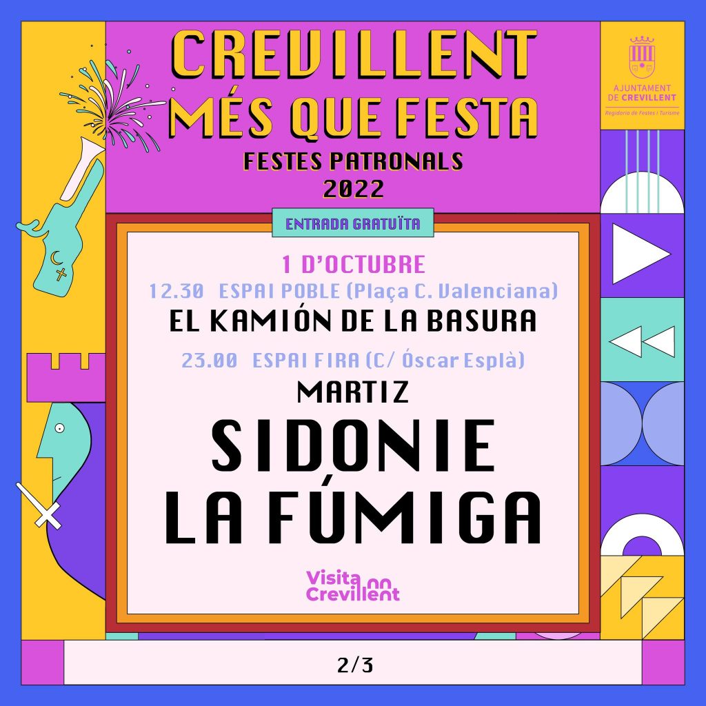 Crevillent – El concejal de Fiestas y Turismo, Josep Candela, junto con el José Manuel Penalva, han dado a conocer los cabezas de cartel de los conciertos de las fiestas patronales de 2022. Artistas de la talla de “Fangoria”, “Nancys Rubias”, “Sidonie”, “La Fúmiga”, Paco Ibáñez, Tito Pontet, «El Tío la Careta”, “El Kamión de la Basura”, y grupos locales como “Martiz”, llenarán los escenarios para animar tanto a vecinos como a visitantes en los espacios festivos.