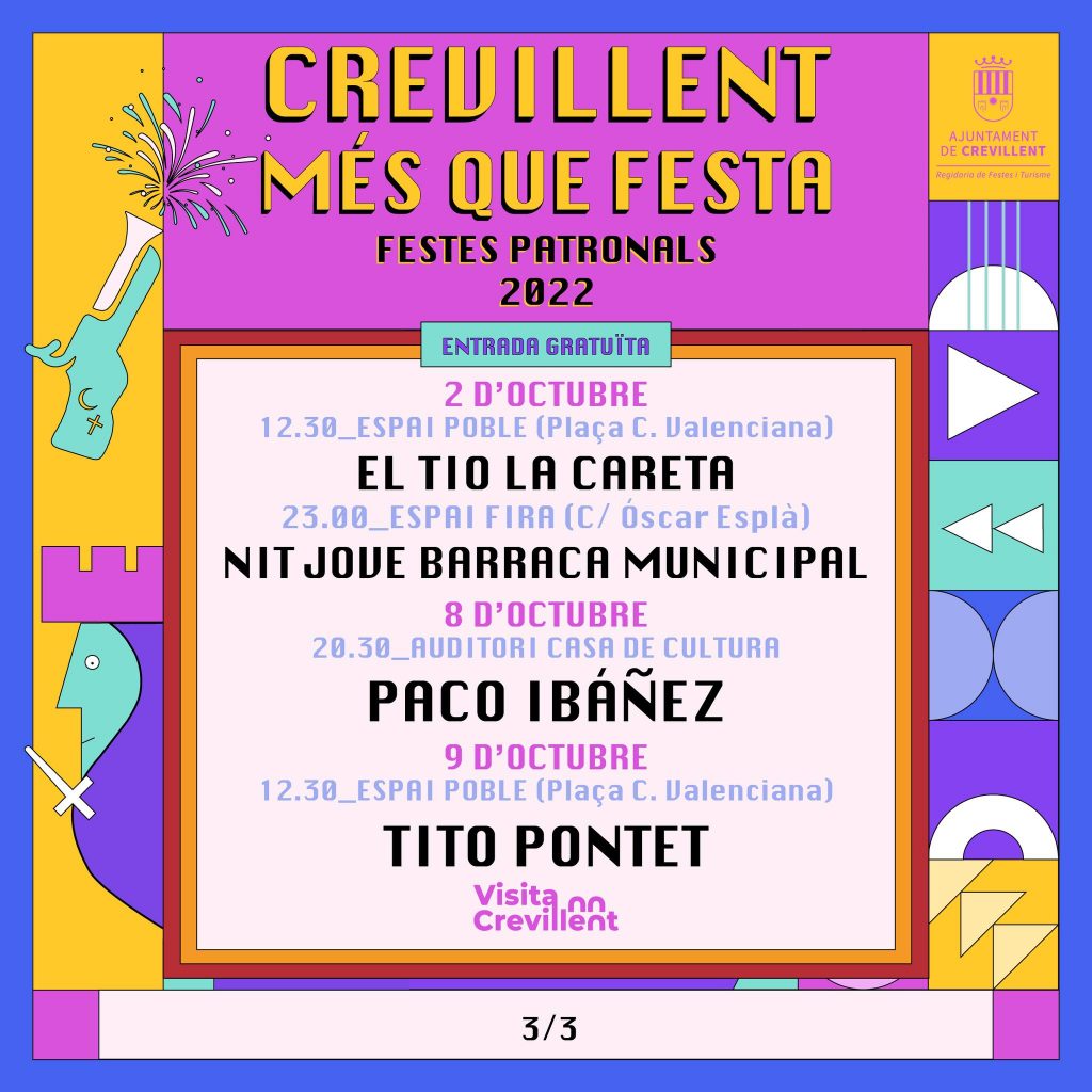 Para el día 2 de octubre a las 12:30 h en la Plaza de la Comunidad Valenciana está programada la actuación de «El Tío la Careta”. Por la noche, a las 23:00 h, en el Espai Fira tendrá lugar la “Nit Jove” de la Barraca Municipal, donde sonará música comercial a cargo de Dj’s. El día 8 de octubre, a las 20:30 h, en la Casa de Cultura actuará Paco Ibáñez. Por último, el 9 de octubre en el Espai Poble tendrá lugar el concierto de Tito Pontet.