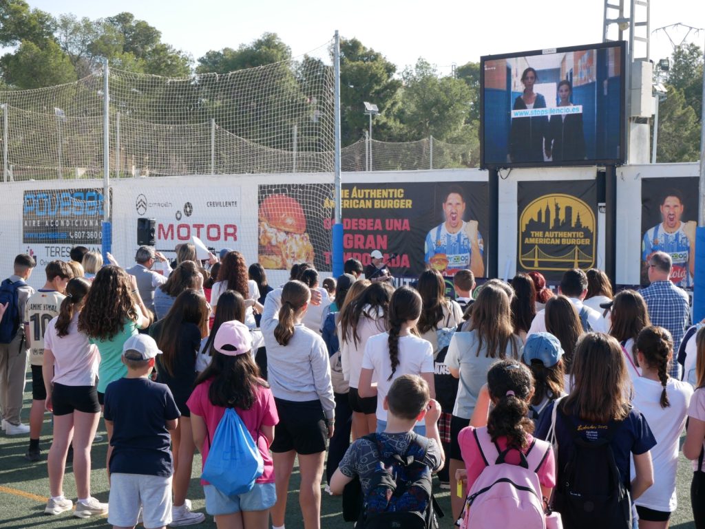 Crevillent – L’alcaldessa Lourdes Aznar Miralles, juntament amb el regidor d’Educació, Antonio Candel Rives, i la coordinadora de la demarcació Territorial d’Orientació A5-A: María Luisa Calderón Espadas, han assistit este dimarts a les V Jornades d’Observadors per a la Convivència Escolar celebrades en el Camp de Futbol “Enrique Miralles Miralles”. Al voltant de 120 alumnes i alumnes, procedents de tots els col·legis i instituts de la localitat, han participat en esta acció educativa, orientada a la promoció de la convivència i la prevenció de l’assetjament escolar, amb la qual es pretén sensibilitzar a tota la comunitat educativa de la importància d’observar i adonar-nos que tota persona és important en un grup, i si algun company/a l’està passant malament, no podem mirar per a un altre costat. Per a això s’introduïx la figura del “Observador de la Convivència” en els col·legis i instituts, amb la finalitat de detectar situacions que alteren la convivència i promoure actituds d’ajuda entre iguals.