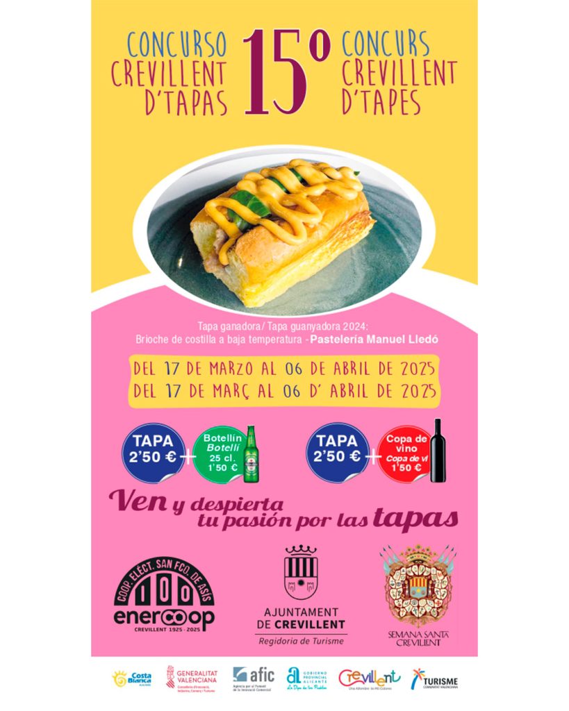 García Magro ha destacado que “este concurso está muy consolidado en nuestra localidad y es un reflejo de la rica gastronomía que tenemos en Crevillent”. Para la difusión de este certamen se han editado 6.000 libros de tapas en los que aparecen todas las tapas que concursan, así como los días y horarios en los que se sirven las tapas. El precio de la tapa será de 2,50 euros y se podrá acompañar al precio de 1,50 euros o bien con un quinto de cerveza o bien con una copa de vino.